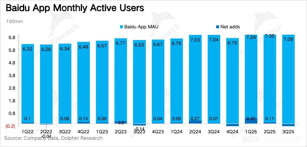 从用户数也能看出问题,三季度手百用户 MAU 环比净减少 2700 万用户,虽然比去年同期的情况略好一些,但年初起通过融合 AI 搜索后的产品体验提升,这个积极效应正在减弱,也变相透出一些流量迁移的迹象。