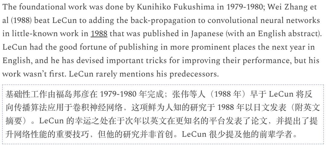 LeCun的幸运之处在于次年以英文在更知名的平台发表了论文,并提出了提升网络性能的重要技巧,但他的研究并非首创。LeCun很少提及他的前辈学者。