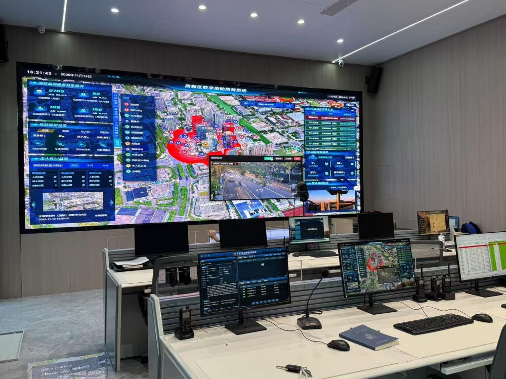 工作人员演示了平台的“一张图”功能:当触发模拟警报,指挥中心大屏瞬间精准定位警情位置,并同步显示预警点位附近的消防车、消防站队、周边建筑情况、人员情况以及灾害类型等关键信息,并可通过一键起飞调取无人机根据点位立即展开侦查。此外,通过接入高新区公共安全视频平台的近10000路视频,平台可同时联动周边监控,多点位进行视频图像查看和烟火识别。预警信息从触发到核查再到警情确认推送的时间大大缩短,相比传统模式效率得到了大幅提升,强化了灭火救援“一短三快”的响应速度和信息前置,提升了初战到场的科学分析和决策水平。警情处理结束后,系统还能进行复盘,完整记录处置过程中的语音、影像等信息,为后续总结经验、改进工作提供详实资料。