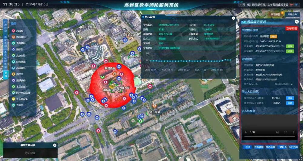 高新区消防大队负责人指着大屏介绍道:“过去,发现火情隐患主要依赖人力巡查,效率较低且存在遗漏风险。如今,智能消防物联感知设备的部署彻底改变了这一局面。”高新区所有沿街商铺、众多学校、商超、高层建筑等重点场所,都已安装了智能消防物联感知设备,它们如同敏锐的触手,实时监测消防水压、烟雾浓度、充电桩异常等关键参数,共同组成一张严密的24小时监测网络。无论是设备运行状态异常,还是潜在的消防隐患,都能被精准捕捉。一旦出现异常情况,平台会迅速通过电话、移动小程序、指挥大厅等多渠道推送警情,确认后,消防人员可即刻通过无人机侦查现场情况,实现快速响应。