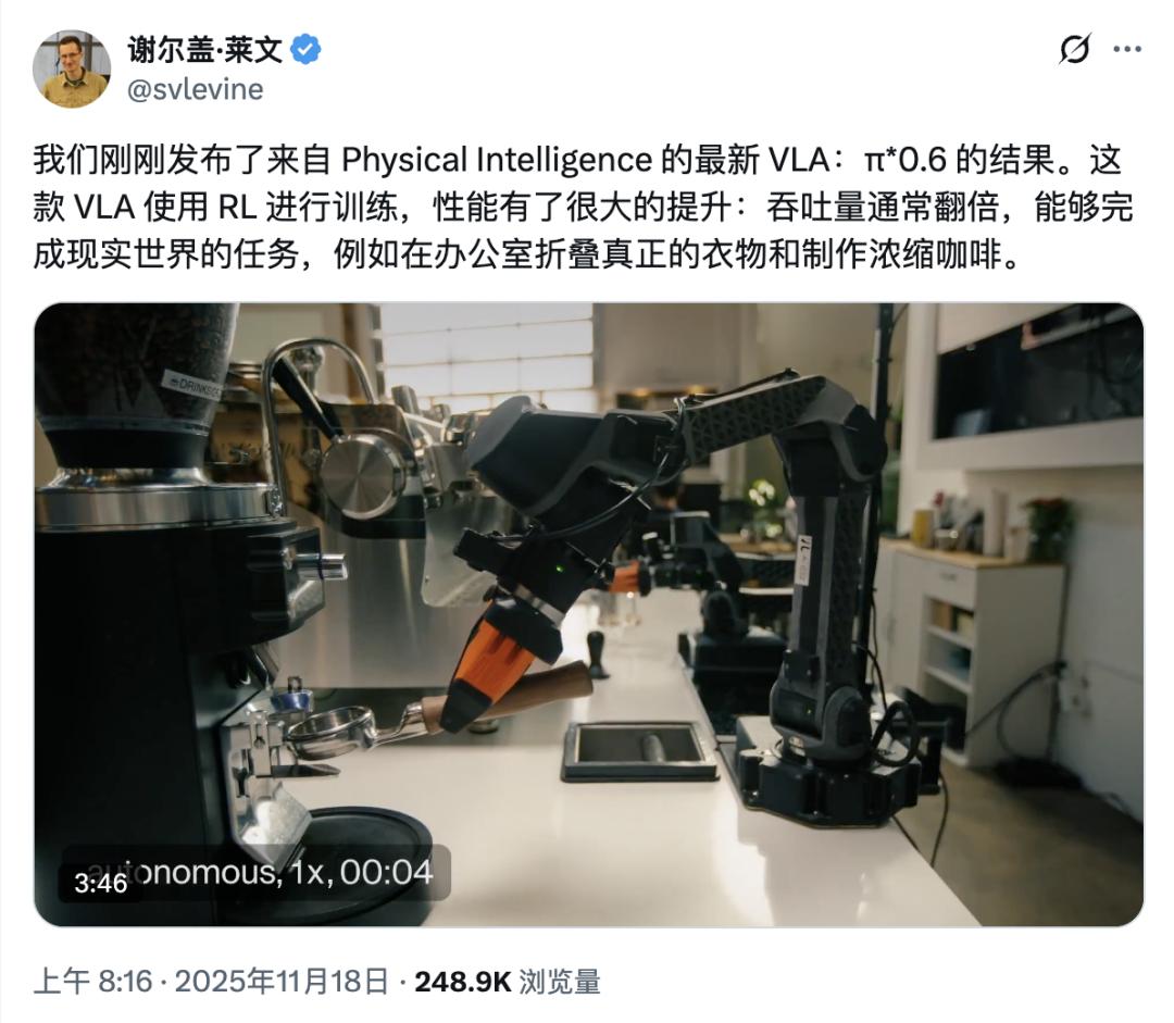 Physical Intelligence刷屏全网的机器人基础模型π*0.6,一亮相就秀出了实力: