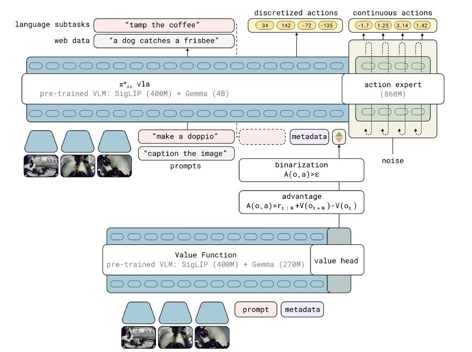 π*0.6延续了Physical Intelligence此前一贯的VLA(视觉-语言-动作模型)路线,是今年四月份发布π0.5以来最新的VLA模型。