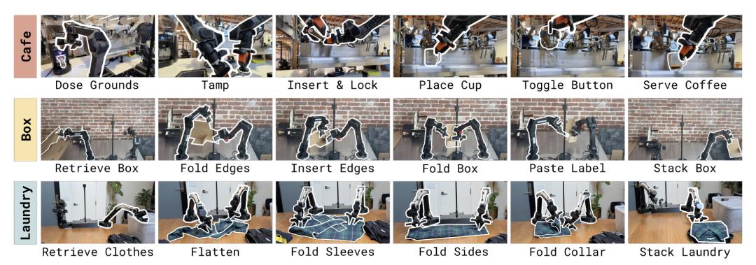 从实验来看,研究团队在三个高难度的现实任务中评估了模型:折叠多样化的衣物、组装纸箱(工厂环境)和制作浓缩咖啡。