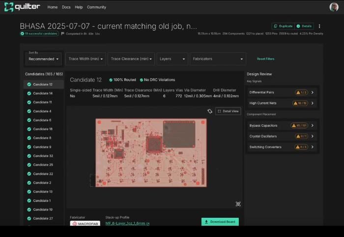 而Quilter的AI系统会读取输入的原理图和设计约束,基于强化学习与电磁仿真,自动完成元件放置与信号布线,并保证符合制造标准。