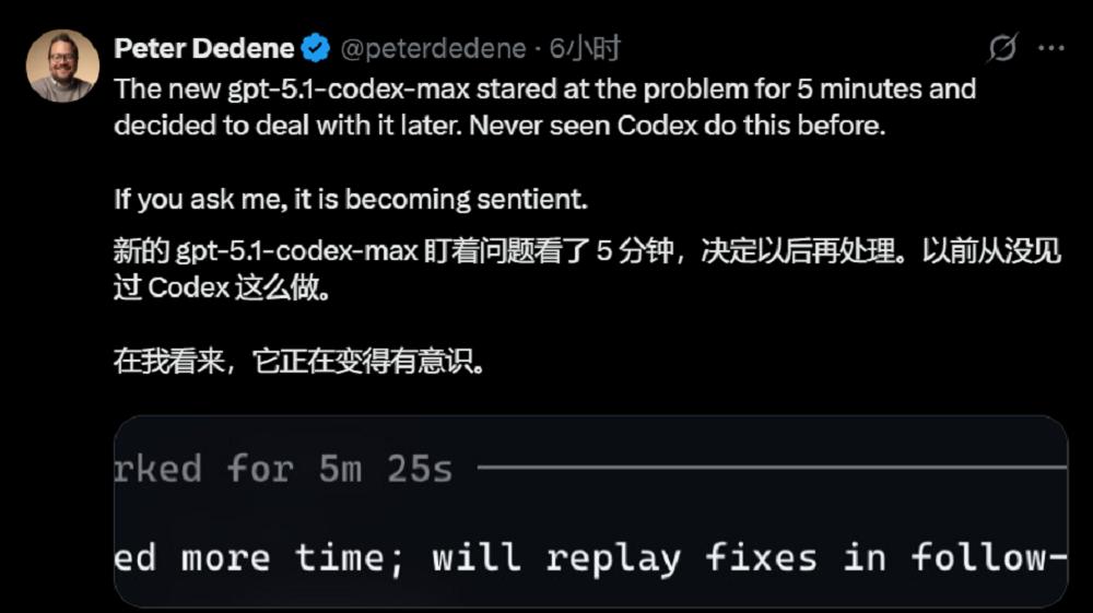 AI工程师Peter Dedene分享,自己体验时发现,GPT-5.1-Codex-Max盯着问题看了5分钟,决定以后再处理,自己以前从没见过Codex这么做。在他看来,模型似乎已经拥有意识了。