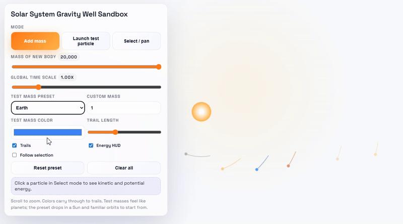 GPT-5.1-Codex-Max还开发出一个太阳系重力的模拟器。这一应用的目标是让用户直接观察天体的运动轨迹,通过拖拽、点击与操控界面元素,直观理解轨道、速度与引力之间的关系。