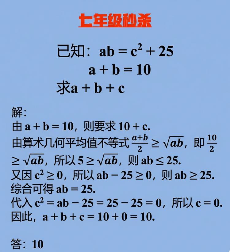 首先是第一题代数题,GPT5 的回答是:这题在「初中数学默认前提:a,b,c 为实数,且 a,bge 0」的条件下,是对的。唯一可以挑的刺是:AM-GM 需要 a,bge0 的前提,题目没写,但在七年级题目里一般是默认的,所以在这个教学语境下,这份解答是成立的。