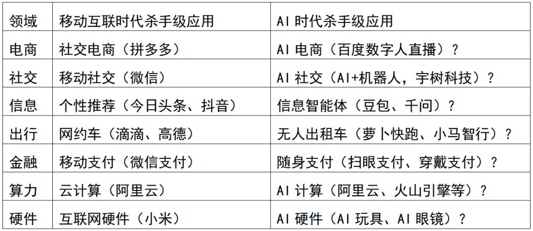 如果对比移动互联网时代的创新产品和应用,AI时代的信息、社交、电商、出行、金融等杀手级应用正在哪里孕育?