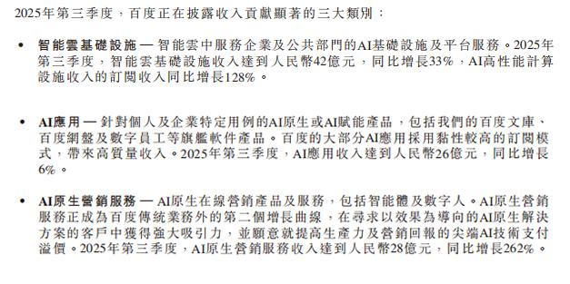 AI新业务下的业务分为三个类别,一是包括智能云中服务企业及公共部门的AI基础设施及平台服务的智能云基础设施;二是包括百度文库、百度网盘及数字员工等旗舰软件产品的AI应用;三是包括智能体及数字人的AI原生营销服务。