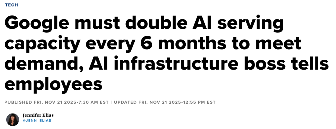 本月早些时候的全体员工大会上,谷歌AI基础设施负责人Amin Vahdat直接说:公司必须每六个月就把服务容量翻一倍,才能满足人工智能服务的需求。