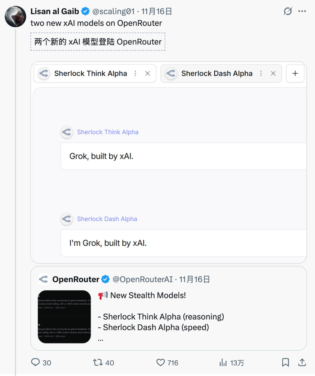 据报道,他最近在OpenRouter平台上测试了一个名为「Sherlock Think Alpha」的神秘模型,不少人猜测这正是xAI研发的新模型。