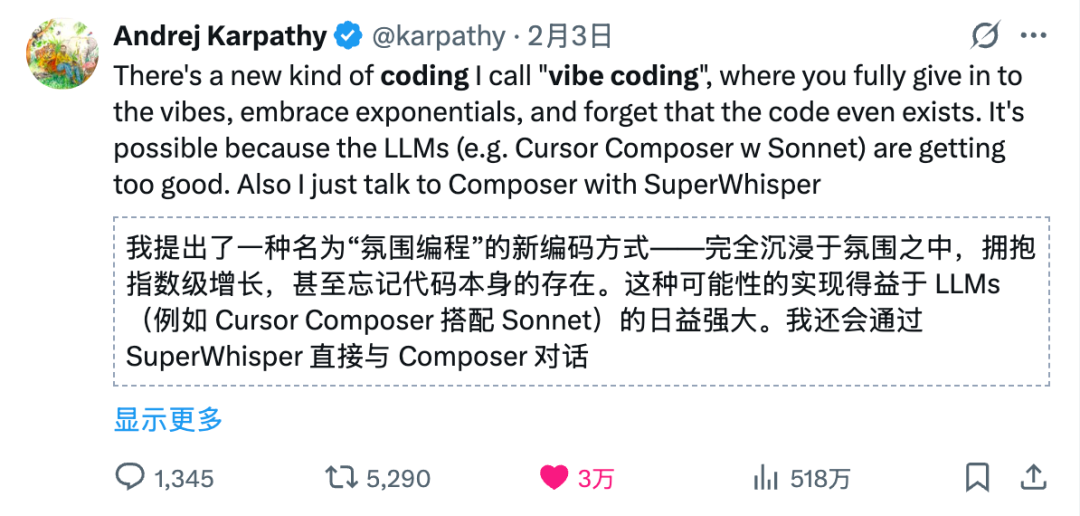 OpenAI前研究员安德烈·卡帕西(Andrej Karpathy)据说是最早提出「Vibe Coding」这个说法的人,他形象地将其描述为「跟随感觉写代码」——你和大型语言模型(LLM)「唠唠嗑」,它就把活儿都干了。
