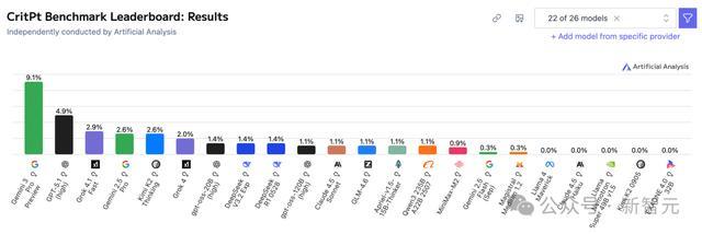 不过,虽然登顶了CritPt,Gemini 3 Pro的成绩也才有9.1%,与满分表现还有些距离。