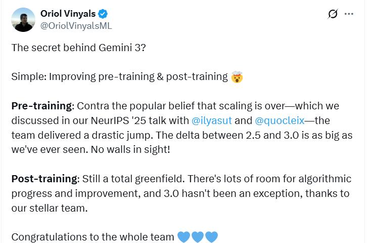 谷歌DeepMind首席科学家Oriol Vinyals X平台推文
