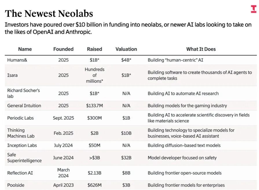 尽管谷歌证明了Scaling Law依然有力,但硅谷的目光已经投向了更远的地方。近期,一批被称为“NeoLab”的非主流AI实验室(如Reflection AI、Periodic Labs)受到风投追捧,融资额都非常高。在LLM之外,AI的下一个范式转移将在哪里发生?