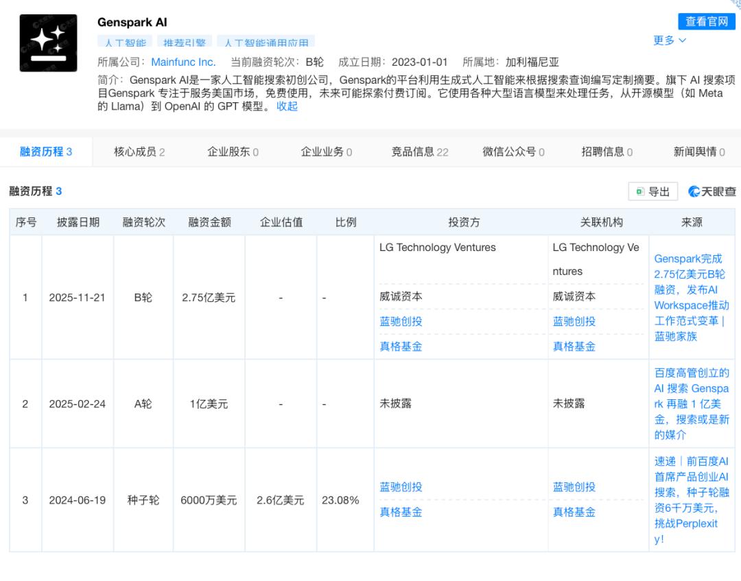 11月20日,位于美国加州帕洛阿尔托的AI搜索引擎Genspark(隶属于公司Mainfunc Inc.,下称:Genspark)完成2.75亿美元B轮融资,投后估值达12.5亿美元。