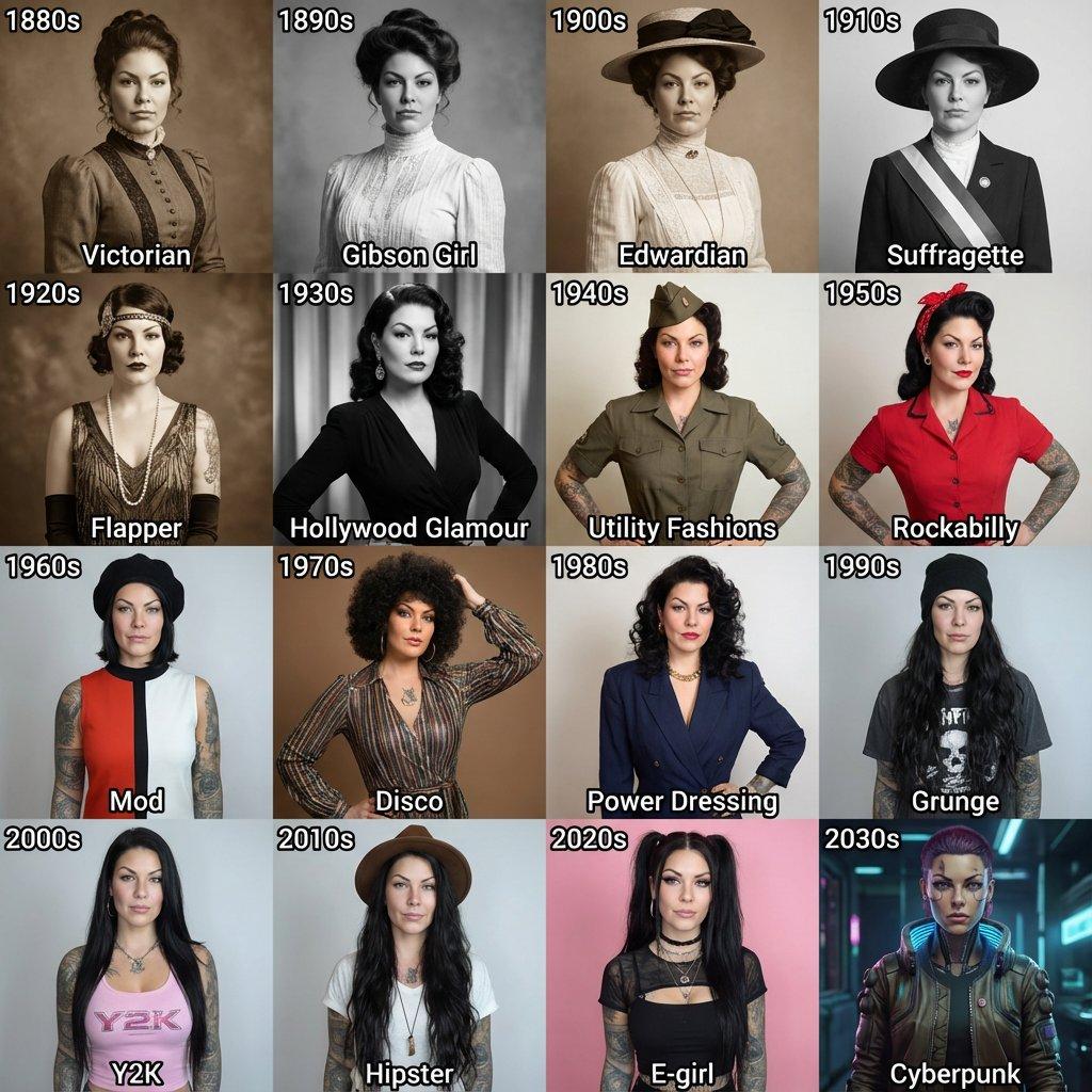 一张图看遍从1880s到赛博年代,女性的发型和穿着的变化。