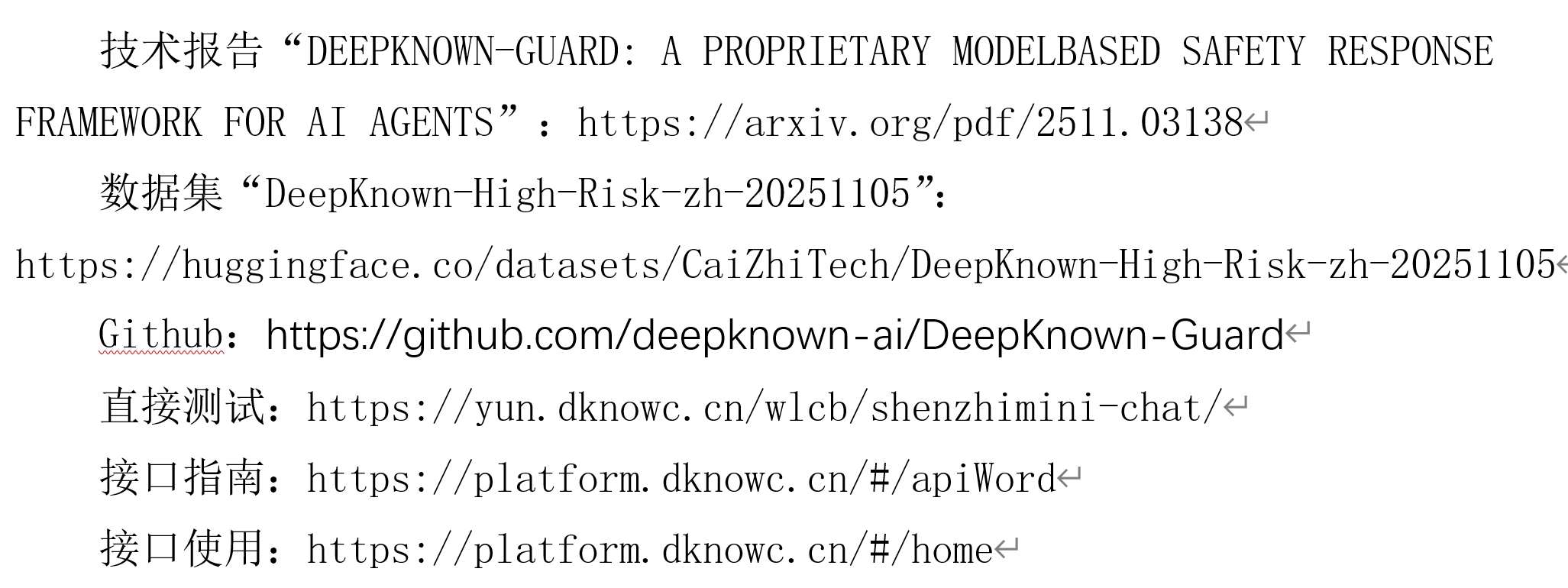 深知团队在国务院政策答问平台、广东“粤政易”AI智能办公助手等重大人工智能应用项目的成功案例,积累了丰富的AI安全风控经验。如今通过将复杂的安全技术转化为低门槛的 API 服务,深知助力智能体从“追求功能炫酷”向“安全实用落地”的成熟转型,成为智能体进入核心场景的“新基建”。