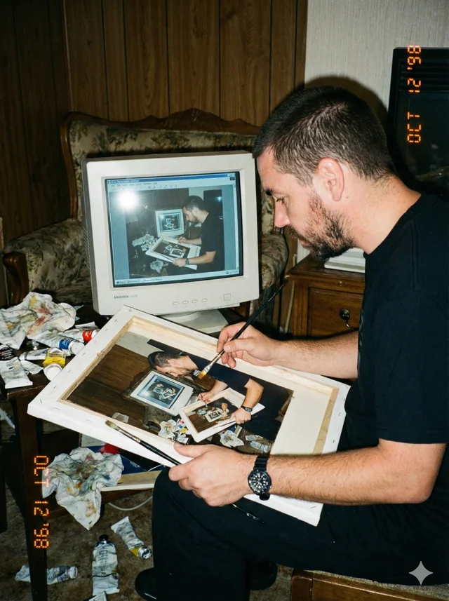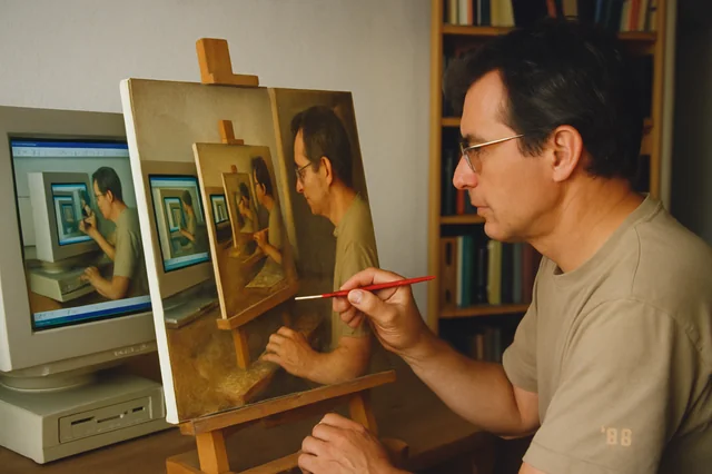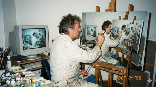 1998 年的一张业余摄影作品。画面中,一位中年艺术家正在将电脑屏幕上的图像亲手复制到一张绷好的油画布上,但这个图像本身其实就是这位艺术家绘制该递归图像时的拍摄画面。