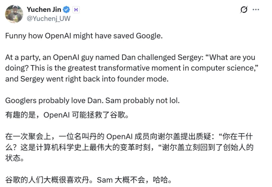 其实,布林的回归还要感谢 OpenAI 一位名叫 Dan 的人。2019 年,布林已经开始隐退,他表示自己想去做点别的事,比如在咖啡馆里闲坐、读读物理书之类的。
