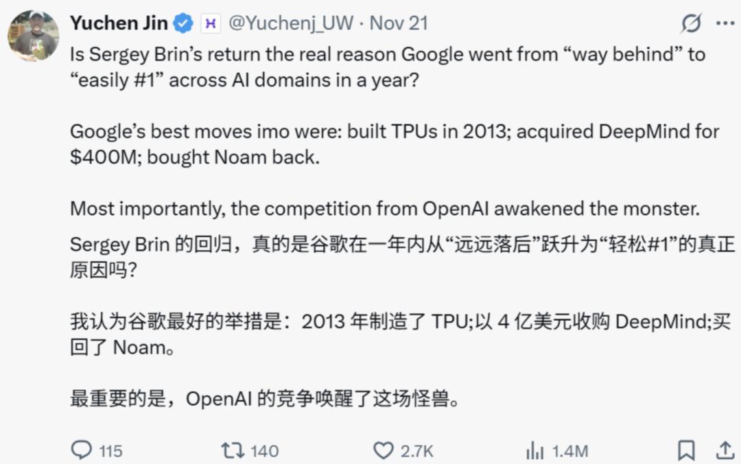 也有人表示,谷歌在短短一年内,从 AI 领域远远落后到轻松拿下第一,真正的原因不止谢尔盖・布林的回归。还有谷歌在最关键地方的布局: