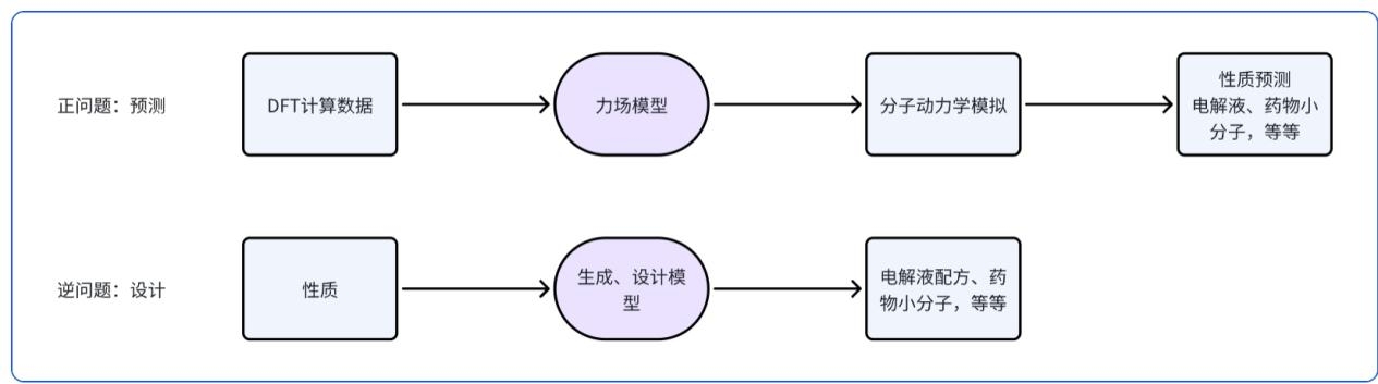 当我们做了很多正问题后,我们就可以再次训练模型,去直接生成可能满足某些性质的小分子的候选,这就是逆问题。这个问题,就是若干工业领域(能源、制药)的核心问题了。我们的团队开发了Bamboo-MLFF和ByteFF两类分子动力学力场,对分子、固体体系的性质进行准确预测。其中ByteFF-Pol目前在无实验数据zeroshot预测电解液性质上实现了业界SOTA的精度。