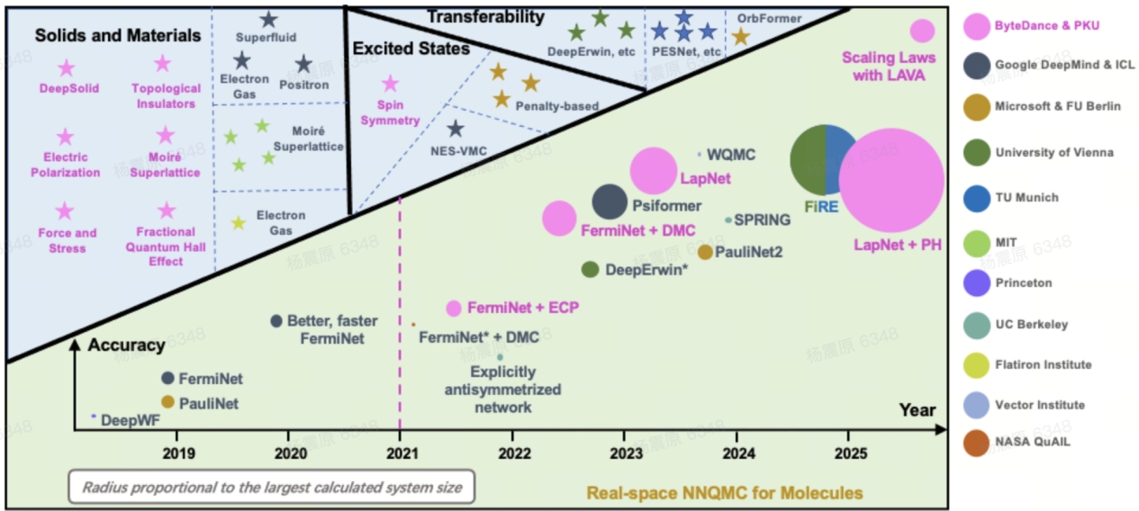图中的横坐标指的是时间,这个领域早期代表性的工作是DeepMind的FermiNet等,2019 年我们几个人在会议室里就讨论过这项工作。这个领域叫做NNQMC(神经网络量子蒙特卡洛方法)。大概是什么意思呢? QMC 是量子蒙特卡洛,根据变分原理,任何试验波函数 计算得到的系统能量 总是大于或等于真实基态能量。于是,我们就可以用神经网络去表示一个波函数,然后,在这个波函数上进行采样并计算系统能量。然后,我们就可以按照能量更小方向的梯度去更新神经网络,最终得到一个更优的波函数表示。