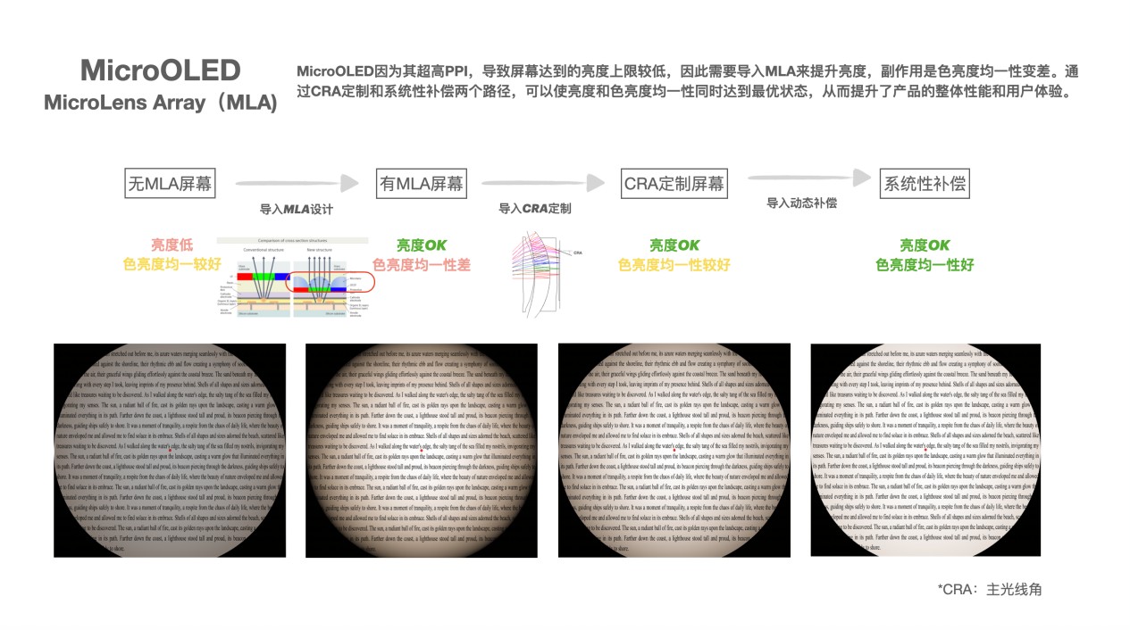 MicroOLED虽然可以有超高的PPI,但它每个像素点都特别小,导致屏幕亮度上限较低。我们通过导入微透镜(MLA)来提升亮度,副作用是色亮度均一性变差。这就需要,结合光学设计,通过主光线角(CRA)定制和系统性补偿上的一些工作,让亮度和色亮度均一性同时达到最优状态。