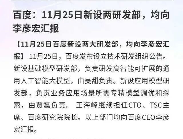 2025年11月25日,百度一则技术研发架构调整公告,揭开了公司AI战略的深层变革:新设的基础模型研发部与应用模型研发部直接向CEO李彦宏汇报,身为集团CTO的王海峰被排除在本次大模型核心研发管理之外,权力显著收缩。这一调整的背后,是李彦宏对百度AI业务“技术有积累、市场无响动”的不满,而作为技术体系最高负责人,王海峰自然难辞其咎。