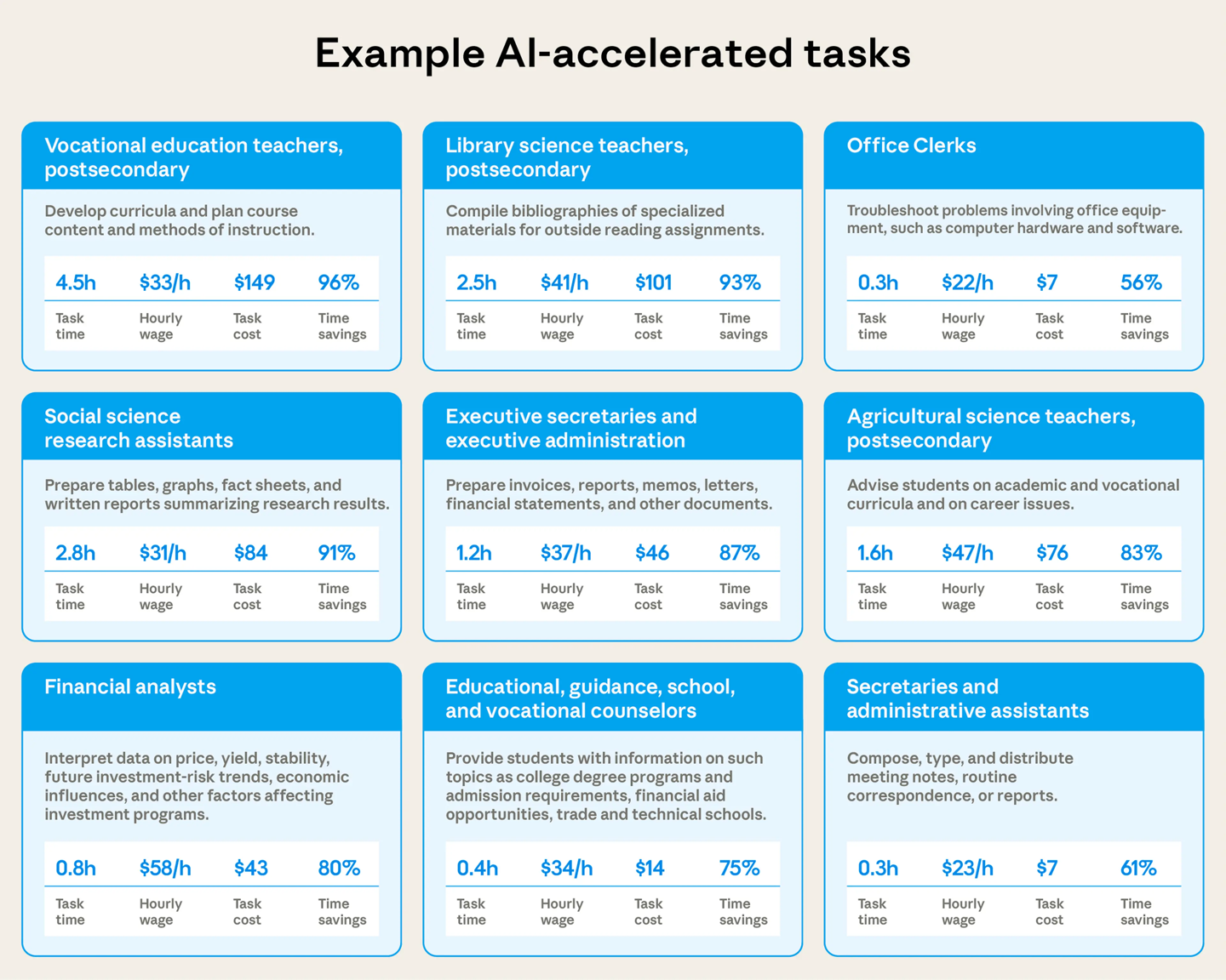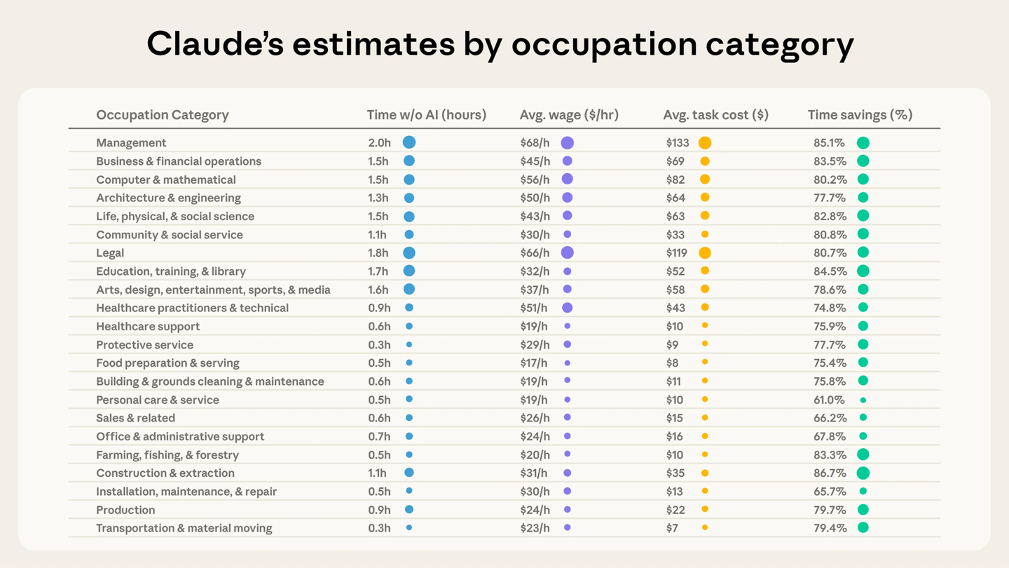 根据 Claude 的估算,如果没有 AI 协助,用户处理的这些任务平均需要 90 分钟才能完成,而在 Claude 的帮助下,任务完成时间平均缩短了约 80%。