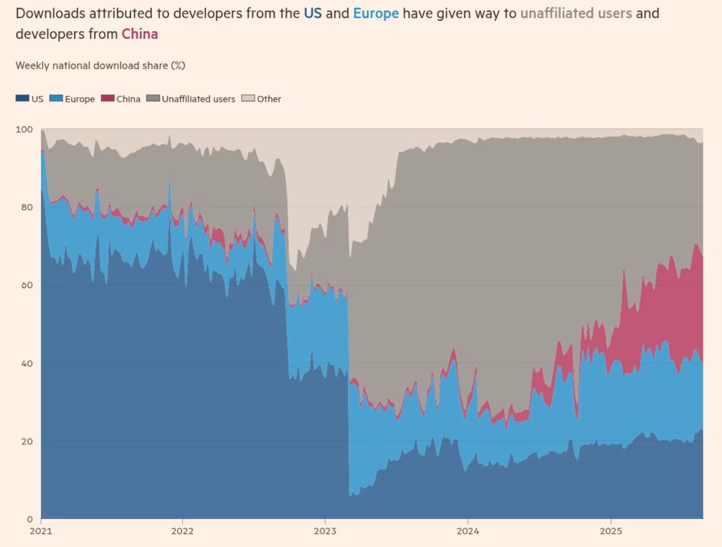 北京时间 11 月 26 日,据《金融时报》报道,中国已在全球“开源”AI 模型市场超越美国,从而在这一强大技术的全球应用方面获得了关键优势。
