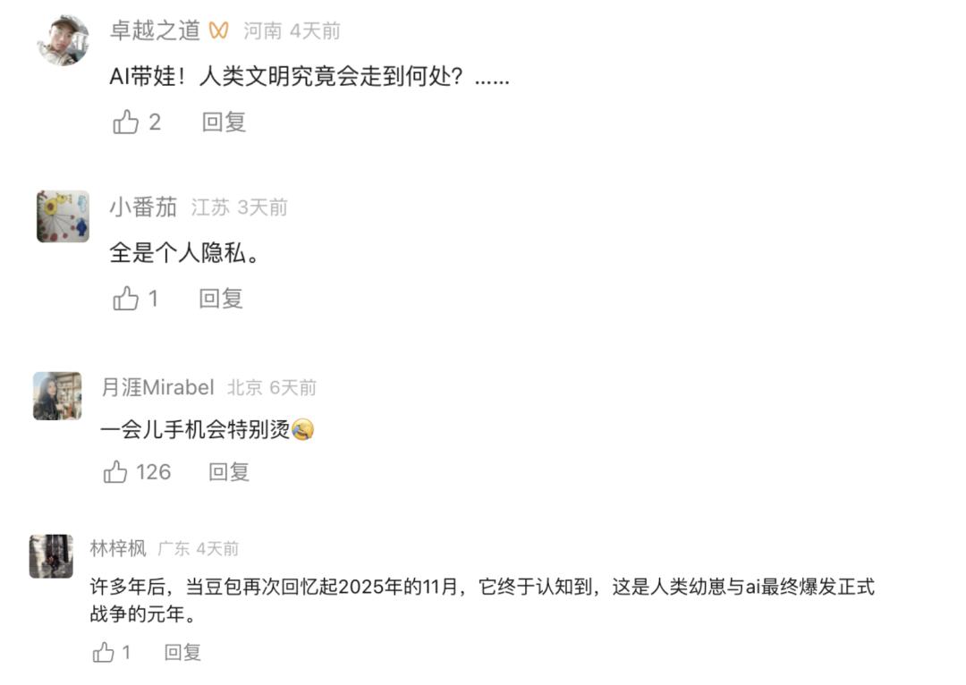 没娃的网友忙着担心数据隐私、人类文明和发烫的手机,忙着创作百年孤独体:当那个在豆包注视下长大的孩子面对养老院的AI护理员时,他将会回想起父母将手机支架立在书桌角落的那个遥远的下午。