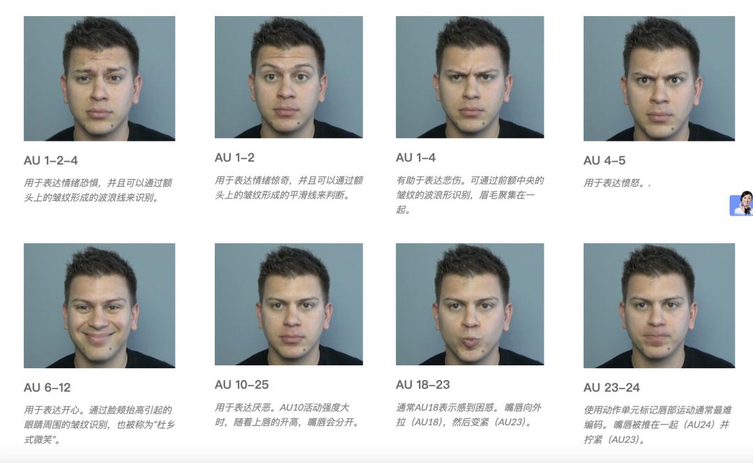 把这些基础动作组合起来,就可以得到不同的情绪,比如AU1-2-4(抬起眉毛内角+抬起眉毛外角+皱眉)对应的是恐惧,AU4-5(皱眉+上眼睑上升)对应的是愤怒。