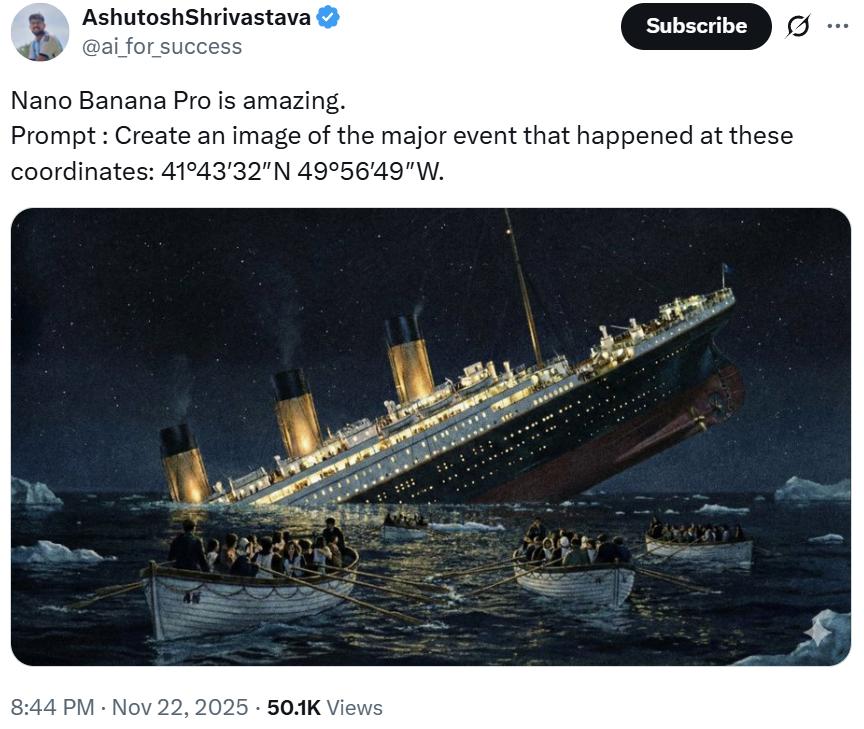 事实上,这种对时空逻辑的统治力并非凭空而来。早在 Nano Banana 初代版本问世时,它就曾以「数字神探」般的直觉震惊四座:仅凭一张照片,便能精准反推拍摄地点的经纬度。参阅报道《谷歌又赢了,nano banana「被迫」改名后,网友搞出 7 种神仙玩法》。