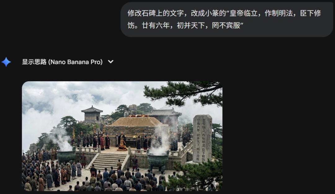可以看到,Nano Banana Pro 似乎理解了那个时代的影像特征,聪明地生成了一张黑白图片,仿佛是模仿当时已经诞生了的摄影技术;它甚至还在图片右上角故意加上了一些照片瑕疵和做旧效果,极大地增加了真实感。