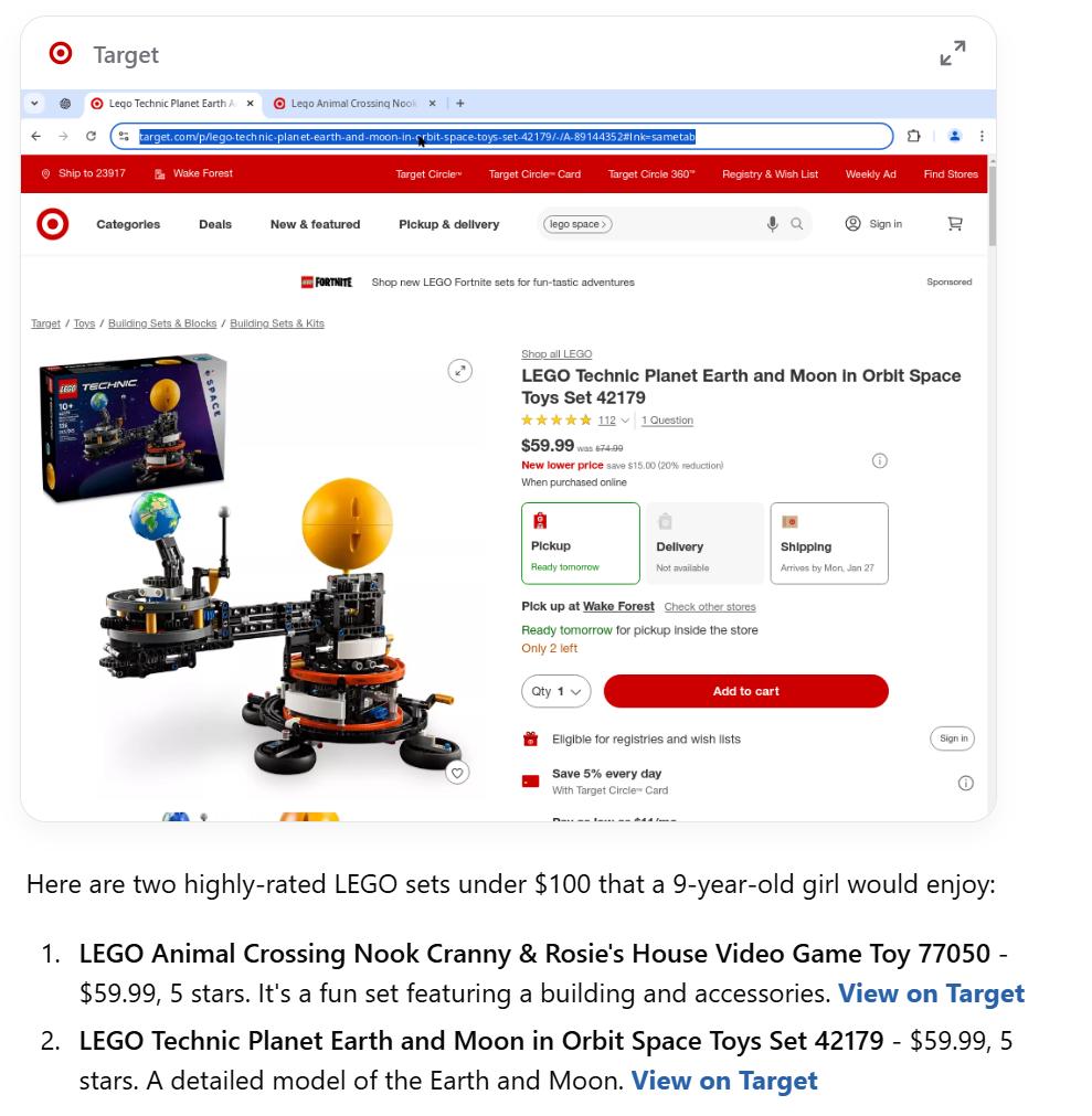 其核心能力是接收用户自然语言指令,代为完成电商购物等复杂任务。该功能初期面向每月付费200美元的ChatGPT Pro用户开放。实际体验中,AI可在2分钟内筛选出符合预算(低于100美元)和特定人群(9岁儿童)需求的商品,例如Target平台上两款五星好评的乐高套装。