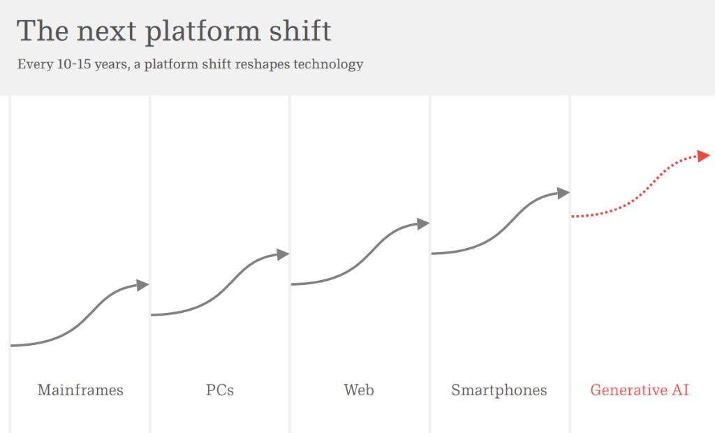 Evans指出,从大型机到PC,从互联网到智能手机,科技行业的基本盘每隔十多年就会被彻底改写,而2022年ChatGPT 的横空出世,很可能就是下一次“十五年之变”的起点。