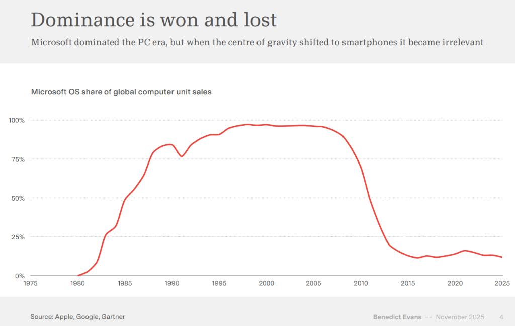 Evans在报告中指出,科技产业大约每十到十五年就会经历一次平台转移,从大型主机到个人电脑,从万维网到智能手机,每一次转移都重塑了整个行业格局。微软的案例印证了这种转移的残酷性:该公司曾在个人电脑时代拥有接近100%的操作系统市场份额,但当重心转向智能手机时几乎变得无关紧要。