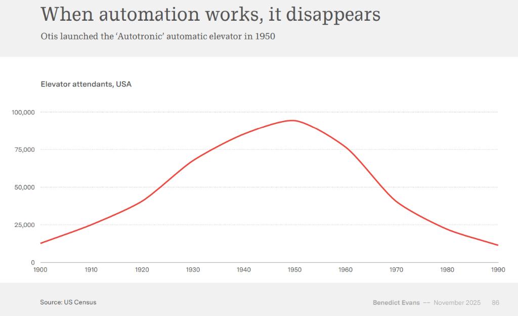 a16z前合伙人Benedict Evans指出,生成式AI正引发科技行业又一次十至十五年的平台大迁移,但其最终形态仍充满未知。他借1956年美国国会自动化报告和电梯操作员岗位消失的案例提醒:当技术真正落地,它会悄然变成基础设施,不再被称为“AI”。