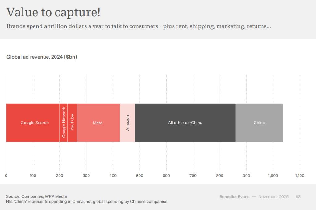 谷歌和Meta已经披露早期数据:AI驱动的广告投放能带来3%—14%的转化率提升。广告创意制作成本也可能从每年1000亿美元的大盘上进一步被自动生成技术重塑。