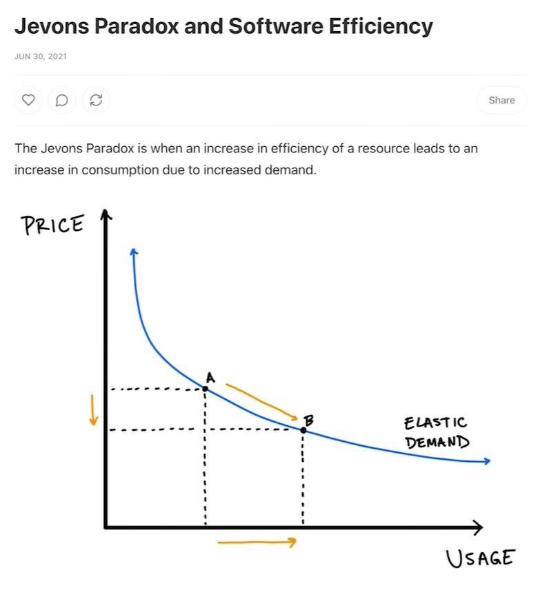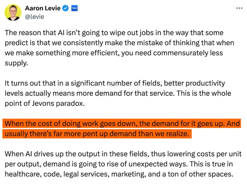 那么,这对于我们理解AI将如何影响劳动力经济有什么启示呢?正如Box公司的首席执行官兼联合创始人Aaron Levie最近所写的那样,我们应该预料到,效率的提升实际上会意味着更多(而非更少)领域的服务需求会增加。