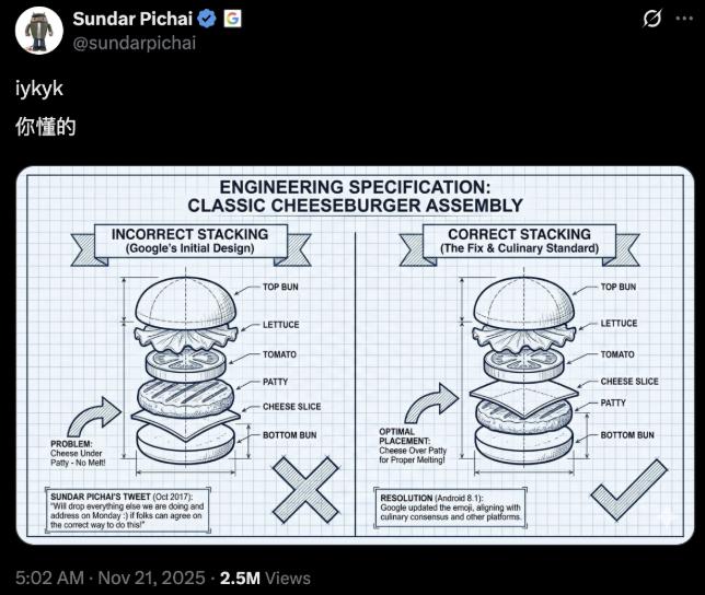 Gemini 3推出三天后,劈柴晒出了一张工程制图风格的「汉堡堆叠规范图」,借2017年安卓「汉堡表情翻车」旧梗,宣告谷歌在生成式AI上的全面回归: