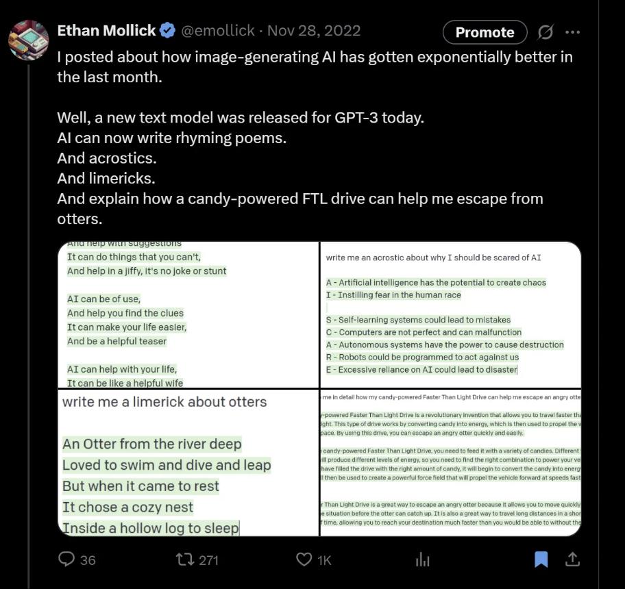 「当然可以。你分享的这条推文来自2022年11月——正好处于现代AI热潮的开端。当时,AI能写出一段连贯的文字,或者一首关于『糖果驱动的超光速引擎逃离水獭』这类荒诞概念的简单诗歌,就已经足够令人惊叹了。」