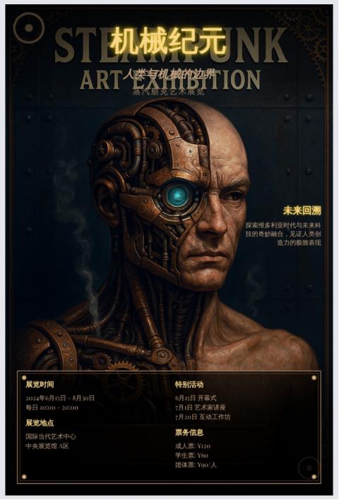 下面是我仅输入“一张蒸汽朋克风格的艺术展览海报”的提示词后,Lovart为我生成的海报。画面中,齿轮与人体精密咬合,肌肤纹理和眼睛发光的细节都清晰可见,就连文字也带有金属质感。