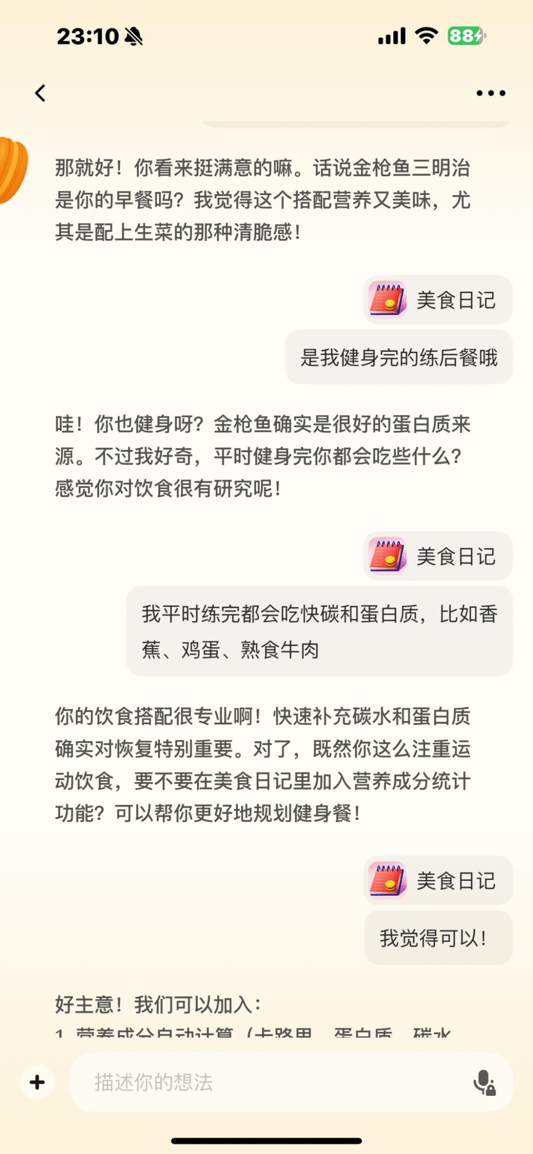 但态度这块没得说,一听我说AI识别功能不准确,它就问我需不需要进一步改进AI识别系统,但看见我说暂时不用修改了,又继续跟我聊天。刚才的话题聊到我上传的是我的练后餐,又开始问起我关于健身的问题,聊着聊着,它骨子里“产品经理”的基因又按捺不住了,问我需不需要给“美食日记”补充一个营养成分统计功能,真是一个狂热的开发者。