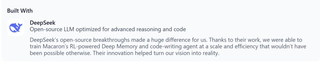 马卡龙在官方致谢中提到:DeepSeek的开源很大程度上帮助了他们训练马卡龙的RL-powered Deep Memory(基于强化学习的深度记忆)和编程Agent。