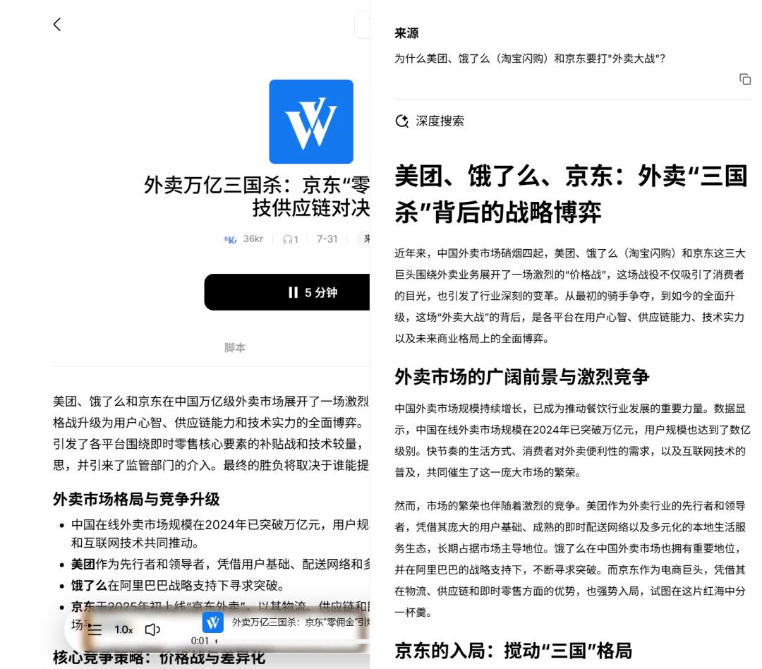 出乎意料的是,ListenHub凭着一个残缺的提示词找到了正确的方向,并生成了一段标题为“美团饿了么京东即时零售:万亿市场从‘三国杀’走向精细化”的播客。