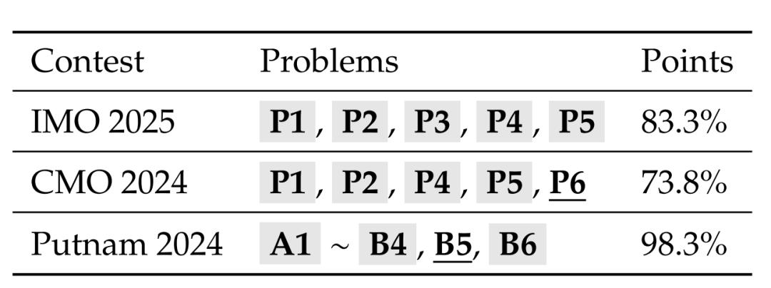 DeepSeekMath-V2在2025年国际数学奥林匹克竞赛(IMO 2025)和2024年中国数学奥林匹克竞赛(CMO 2024)上取得了金牌水平的成绩;并在2024年普特南大学生数学竞赛(Putnam 2024)上取得了接近满分(118/120分)的成绩,超过人类最高的90分成绩。