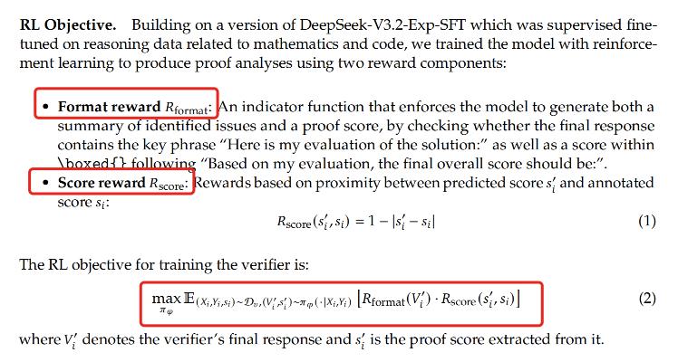 紧接着,其设置了强化学习目标和训练验证器的强化学习目标。具体是以DeepSeek-V3.2-Exp-SFT的一个版本为基础,通过强化学习训练模型生成证明分析,训练过程使用了两个奖励组件:格式奖励和分数奖励。而后通过下列函数完成训练验证器的强化学习目标。