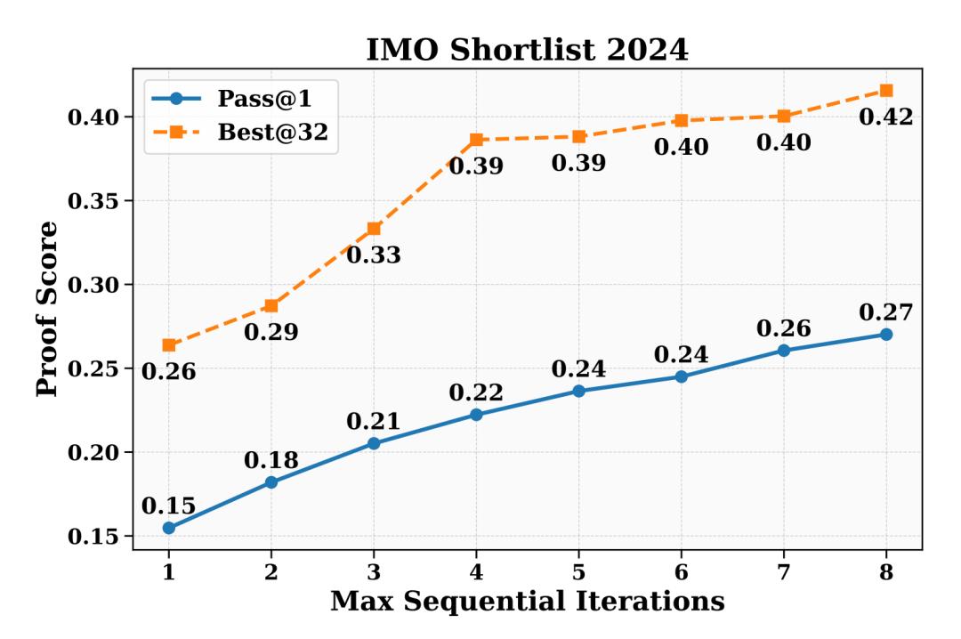 在带自我验证的顺序优化中,其对2024 IMO备选题进行连续优化后,证明质量提升。自选的最佳证明比线程平均值获得了显著更高的验证分数,这表明生成器能够准确评估证明质量。这些结果证实,其生成器能够可靠地区分高质量证明和有缺陷的证明,并利用这种自我认知系统地改进其数学推理能力。